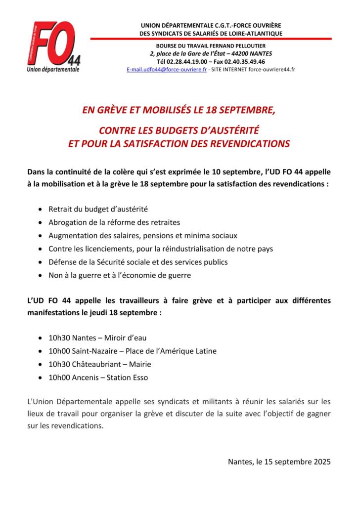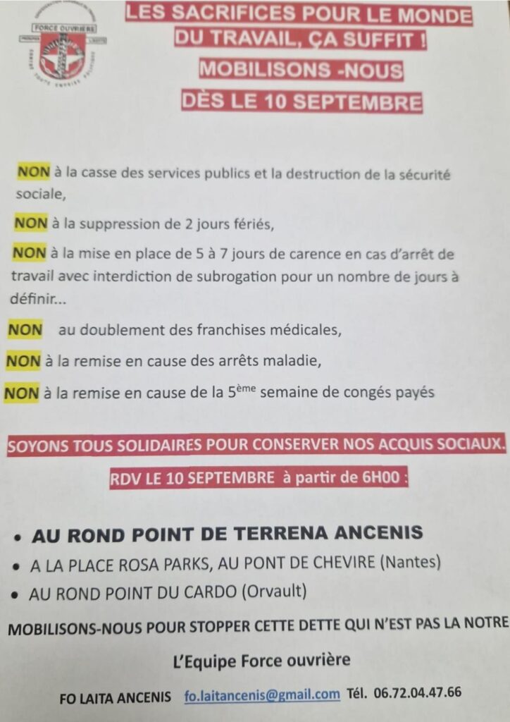Nous avons pris connaissance de l’appel citoyen à bloquer le pays à compter du 10 septembre et de plusieurs appels, FO, CGT, Solidaires, de la sécurité sociale, de la santé, des services, de la métallurgie, de plusieurs unions locales et départementales FO et CGT, qui ont décidé d’appeler à la grève sur la base de revendications claires, à partir du 10 septembre :
