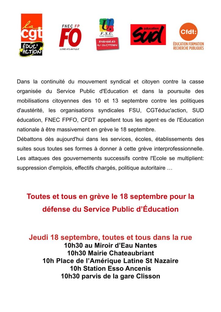 Le SNUDI FO 44 appelle tous les collègues des écoles du département, PE, AESH et PsyEN, à se mettre en grève dès le 18 septembre et à participer à toutes les actions et mobilisations qui seront décidées pour stopper cette escalade austéritaire infernale.