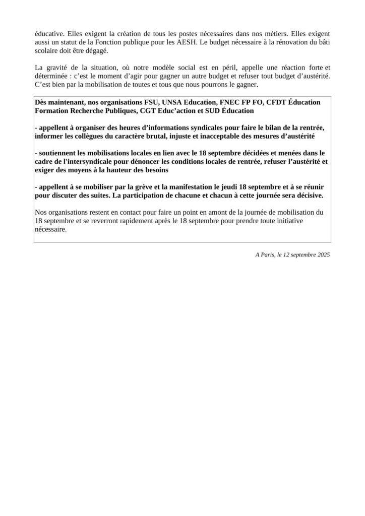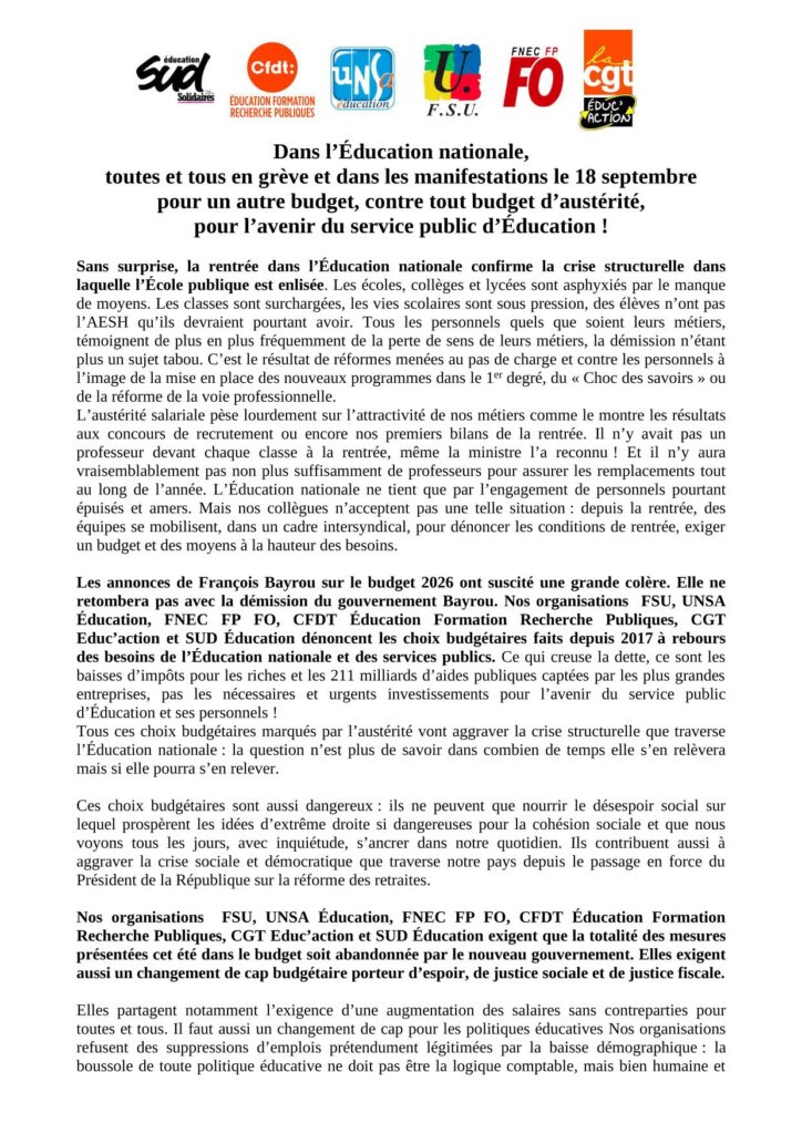 Nous refusons que l’École Publique et ses personnels soient sacrifiés sur l’autel des 44 milliards de coupes budgétaires prévues dans le budget d’austérité sans précédent du gouvernement Bayrou, tout comme nous refusons le démantèlement de la Sécurité sociale.