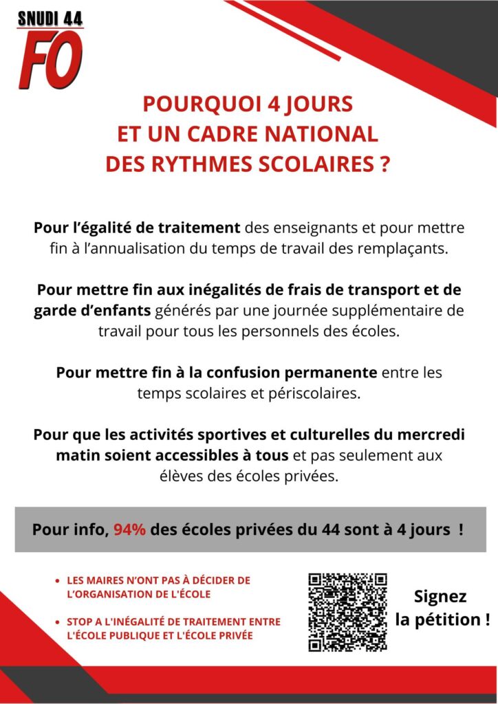 Le SNUDI FO 44 continue à revendiquer un cadre national pour les rythmes scolaires :