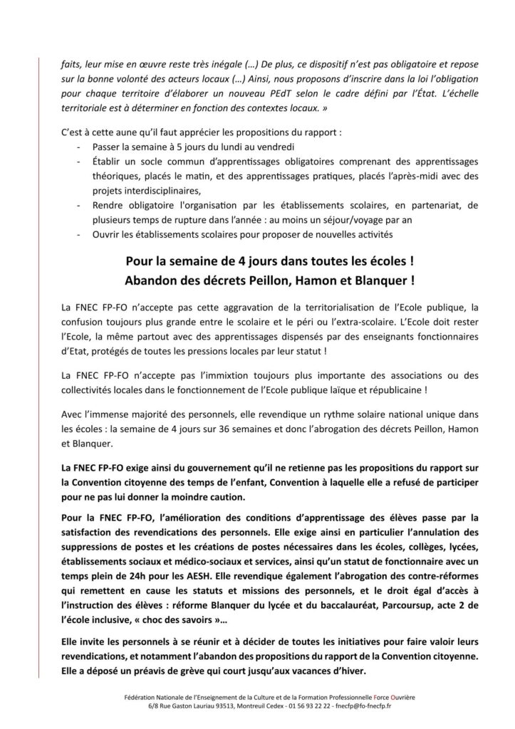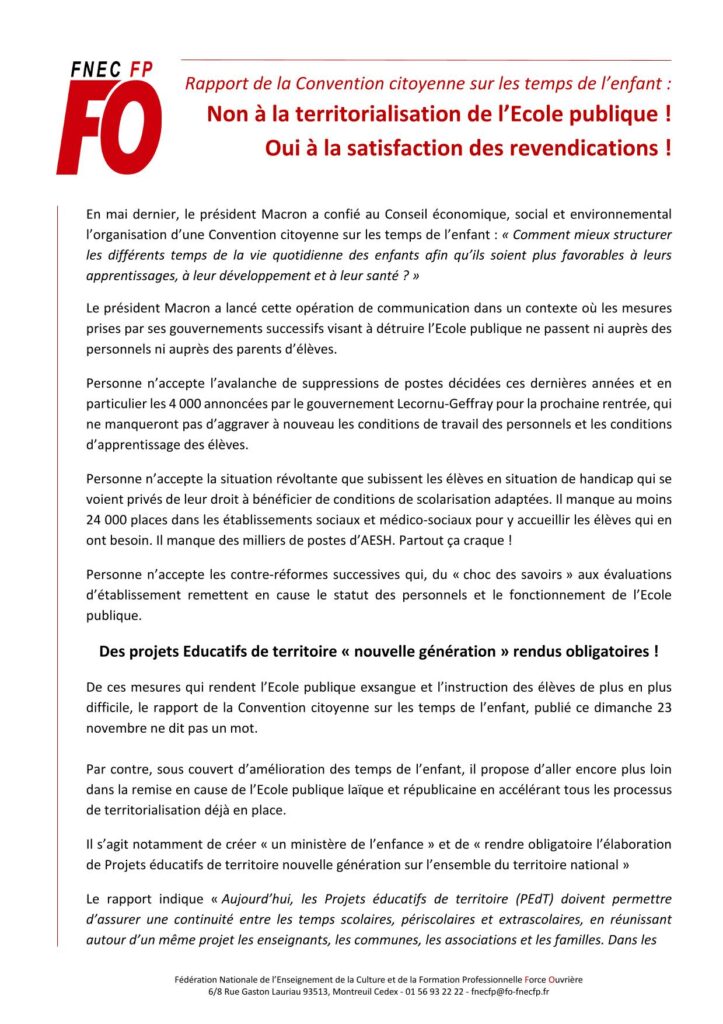 Communiqué de la FNEC-FP-FO : Rapport de la Convention citoyenne sur les temps de l’enfant : Non à la territorialisation de l’École publique ! Oui à la satisfaction des revendications !