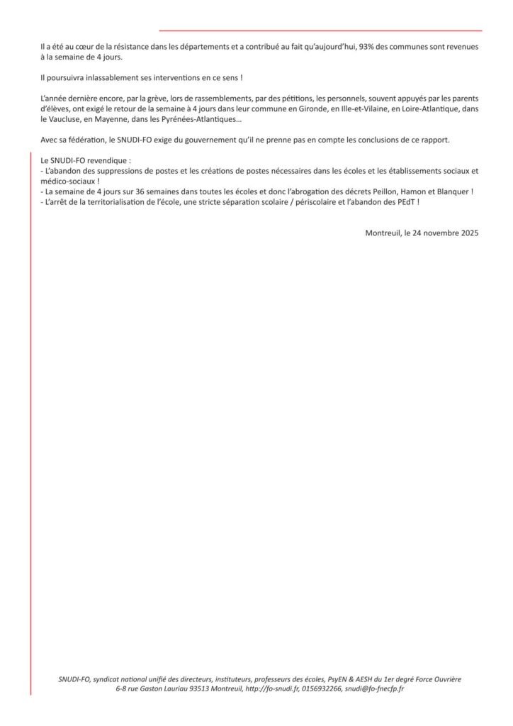 Alors que l’État a supprimé les aides péri-éducatives pour les communes à 5 jours à la rentrée 2025, alors que 96% des communes en France qui sont revenues à la semaine de 4 jours grâce aux mobilisations organisées par FO, alors que plus de 70% des écoles publiques fonctionnent sur 4 jours, alors que les décrets Peillon-Hamon-Blanquer sur les rythmes scolaires sèment la confusion et la division entre les collègues, le président Macron voudrait lui aussi berner les personnels et les parents d’élèves avec des belles promesses pour « adapter l’Ecole au rythme des enfants ».