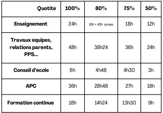 Le service hebdomadaire est de 24 heures devant élèves. Toute heure supplémentaire effectuée, comme dans le cas d’un service partagé entre une école à 4 jours et une école à 4,5 jours par exemple, est considérée comme du sur-service et ouvre droit à récupération.